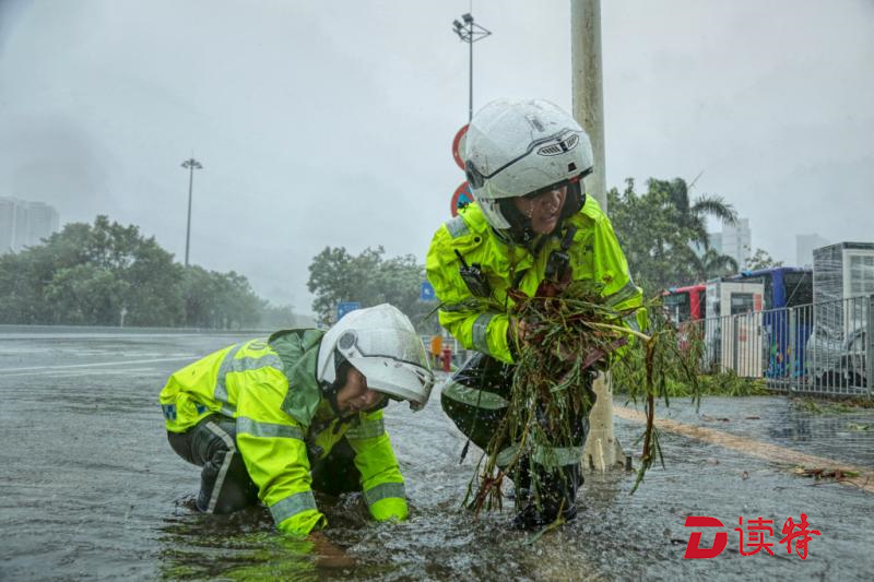 但是,眼前的情況,他們無(wú)法視而不見(jiàn)。深鹽二通道下方,羅沙路羅湖公安分局調(diào)頭口處,當(dāng)艾力軍經(jīng)過(guò)這里時(shí)發(fā)現(xiàn)由于地勢(shì)低洼路面已經(jīng)嚴(yán)重積水,他們馬上停下車(chē),疏通下水道。一行人在風(fēng)雨中走進(jìn)機(jī)動(dòng)車(chē)道,沿著路邊只能用手在積水中摸索排水口的位置,將阻塞入水口的樹(shù)枝樹(shù)葉掏出來(lái)。但風(fēng)急雨驟,道路積水水位剛下降一點(diǎn),剛被清理的下水道又堵樹(shù)葉、樹(shù)枝等雜物堵上,他們只好不斷地進(jìn)行著重復(fù)的動(dòng)作。而此時(shí),臺(tái)風(fēng)“山竹”距離深圳接近130公里,羅湖片區(qū)測(cè)得最大陣風(fēng)達(dá)16級(jí)。
