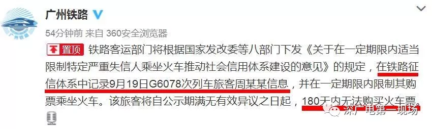 據(jù)@廣州鐵路今天上午10點(diǎn)25分通報(bào)稱,鐵路客運(yùn)部門將根據(jù)國(guó)家發(fā)改委等八部門下發(fā)《關(guān)于在一定期限內(nèi)適當(dāng)限制特定嚴(yán)重失信人乘坐火車推動(dòng)社會(huì)信用體系建設(shè)的意見》的規(guī)定,在鐵路征信體系中記錄9月19日G6078次列車旅客周某某信息,并在一定期限內(nèi)限制其購(gòu)票乘坐火車。