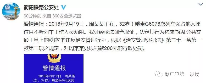 今天上午10點(diǎn)多,@衡陽鐵路公安處發(fā)布警情通報(bào)稱,2018年9月19日,周某某(女,32歲)乘坐G6078次列車強(qiáng)占他人座位且不聽列車工作人員勸阻。