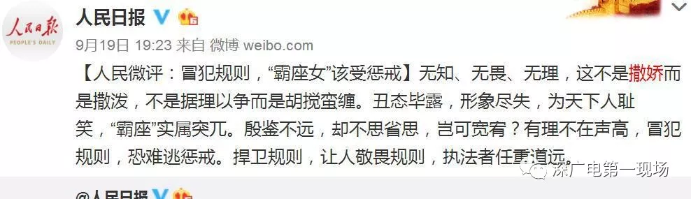 對(duì)此,@人民日?qǐng)?bào)官方微博昨晚發(fā)表評(píng)論【冒犯規(guī)則,“霸座女”該受懲戒】:無知、無畏、無理,這不是撒嬌而是撒潑,不是據(jù)理以爭(zhēng)而是胡攪蠻纏。丑態(tài)畢露,形象盡失,為天下人恥笑,“霸座”實(shí)屬突兀。殷鑒不遠(yuǎn),卻不思省思,豈可寬宥?有理不在聲高,冒犯規(guī)則,恐難逃懲戒。捍衛(wèi)規(guī)則,讓人敬畏規(guī)則,執(zhí)法者任重道遠(yuǎn)。