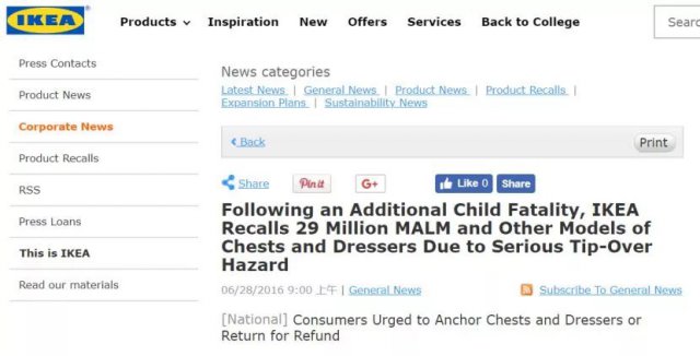 2016年6月28日,宜家開始在美國和加拿大市場(chǎng)召回馬爾姆(Malm)抽屜柜。