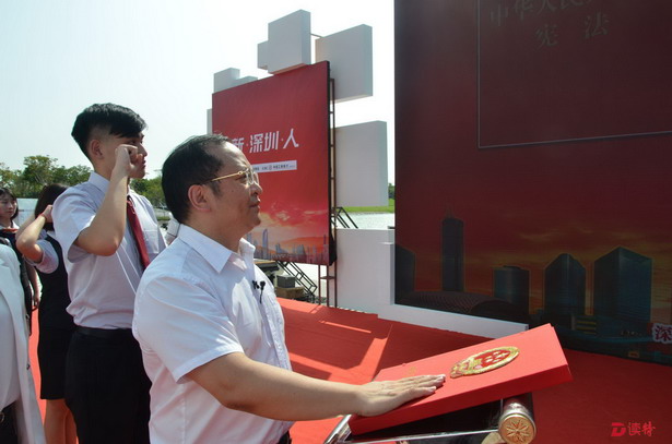 9月21日上午,深圳市普法辦、深圳市司法局和深圳廣電集團在深圳人才公園潮汐廣場舉辦2018年“新深圳人”向《中華人民共和國憲法》宣誓儀式,深圳市政協(xié)副主席黎軍監(jiān)誓,深圳市司法局局長蔣溪林帶領(lǐng)20名“新深圳人”代表面對憲法莊嚴(yán)宣誓。市民向憲法宣誓,在全國尚屬首次。