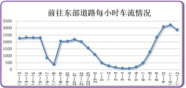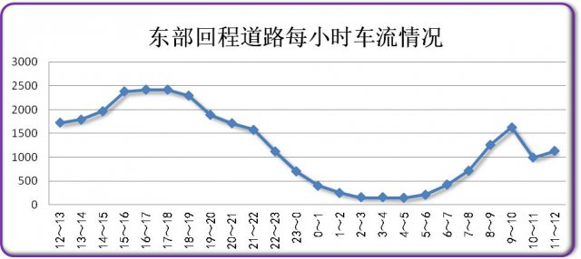 今日上午8時(shí)開始,東部回程的車輛增多,9時(shí)達(dá)到峰值,約1629輛。
