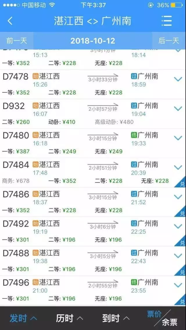 以10月19日廣州-珠海的票價來看,票價打折的車次發(fā)生了變化,D7601次的票價顯示為八折,其中二等座56元,比打折前便宜14元。原來打折的D7262車次恢復(fù)了原價。