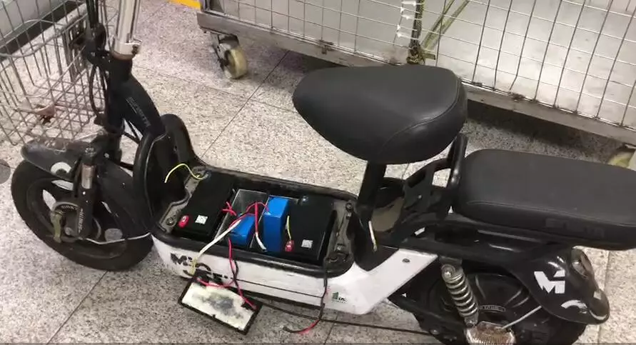 “當時看到這名旅客電單車的腳踏板位置比車身其他位置要干凈一些、新一些,就進行了檢查。檢查發(fā)現(xiàn)腳踏板可以直接掀起來,里面的電池盒外表也比較新,這就不太正常了?!爆F(xiàn)場關(guān)員介紹道。隨后,關(guān)員對電動單車電池盒進行了拆卸。