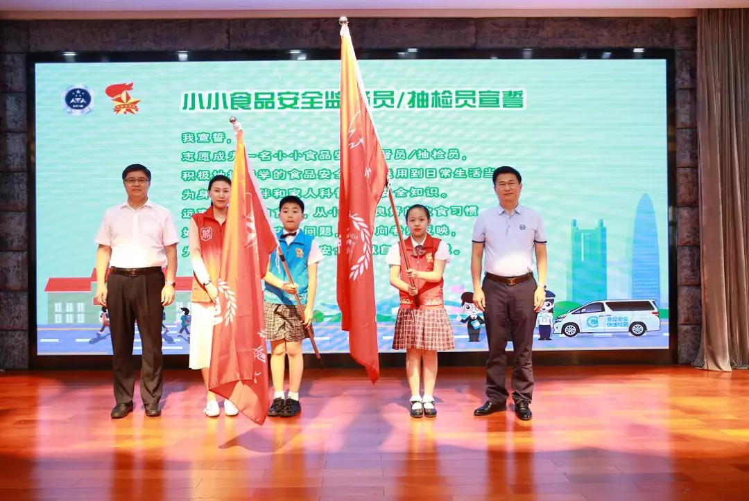 作為全市首個(gè)“小小食品安全志愿者”活動試點(diǎn)學(xué)校,荔園小學(xué)(西校區(qū))的兩名學(xué)生代表進(jìn)行了志愿者宣誓,市城管局副局長馮增軍、市教育局學(xué)校安全管理處處長肖偉峰為兩名小小志愿者授旗。