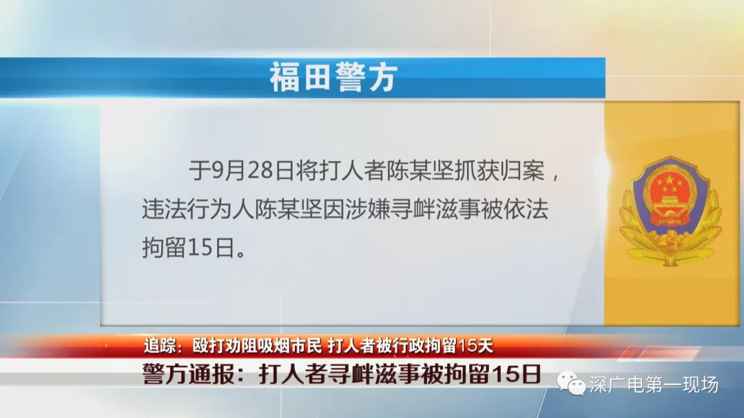 事情發(fā)生之后,福田警方很快介入調(diào)查,于9月28日將打人者陳某堅抓獲歸案,違法行為人陳某堅因涉嫌尋釁滋事被依法拘留15日。