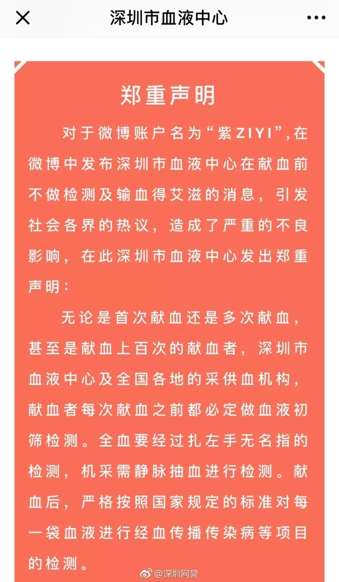 @深圳市血液中心發(fā)出鄭重聲明:無論是首次獻(xiàn)血者還是多次甚至是上百次的獻(xiàn)血者,每次獻(xiàn)血都必須做初篩檢測,全血要經(jīng)過扎左手無名指的檢測,機(jī)采需靜脈抽血進(jìn)行檢測。獻(xiàn)血后,嚴(yán)格按照國家規(guī)定的標(biāo)準(zhǔn)對(duì)每一袋血液進(jìn)行經(jīng)血傳播傳染病等項(xiàng)目的檢測。
