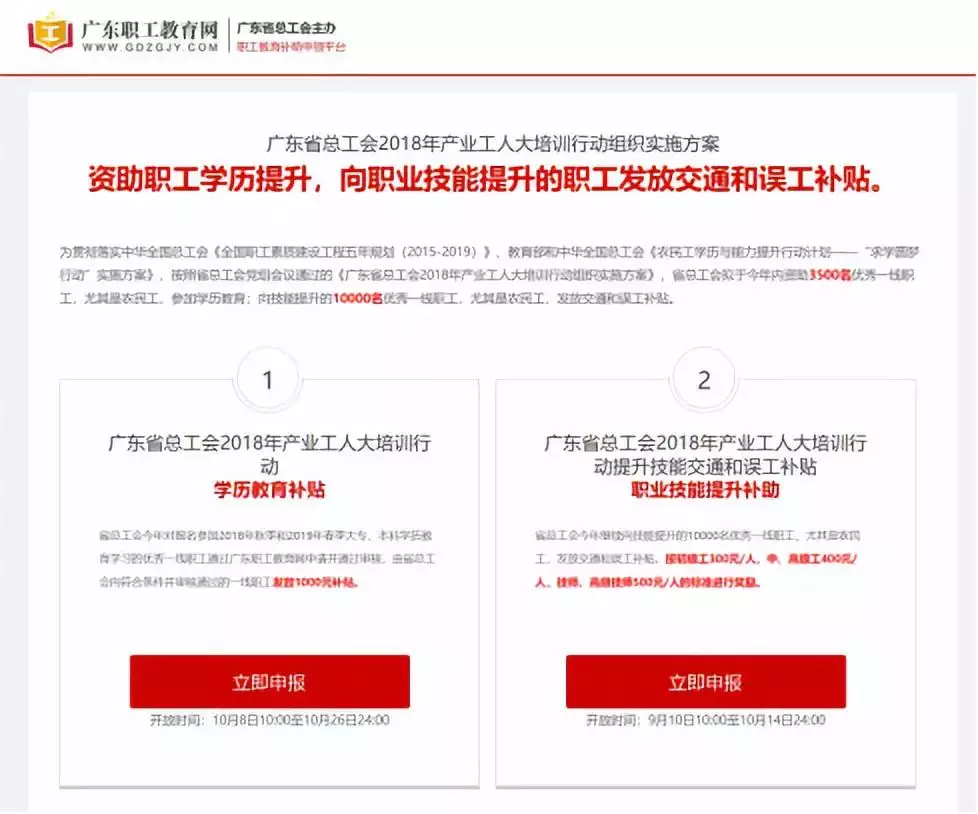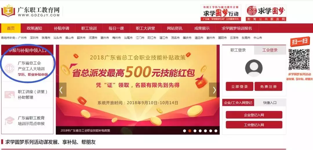 在網(wǎng)站(www.gdzgjy.com)首頁(yè)左側(cè)【申報(bào)與補(bǔ)貼申領(lǐng)入口】,點(diǎn)擊“廣東省總工會(huì)產(chǎn)業(yè)工人大培訓(xùn)學(xué)歷、職業(yè)補(bǔ)貼申領(lǐng)”界面,選擇右側(cè)“職業(yè)技能提升補(bǔ)助”點(diǎn)擊【進(jìn)入申領(lǐng)】。