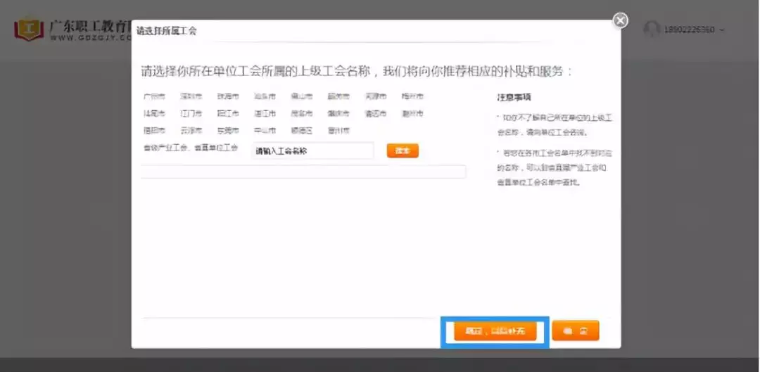1.進(jìn)入個(gè)人中心頁面,系統(tǒng)自動彈出工會所屬窗口,選擇所屬工會,如仍未確定所屬工會,可點(diǎn)擊【跳過,以后補(bǔ)充】;如已確定所屬工會,請選擇所屬工會,點(diǎn)擊【確定】;