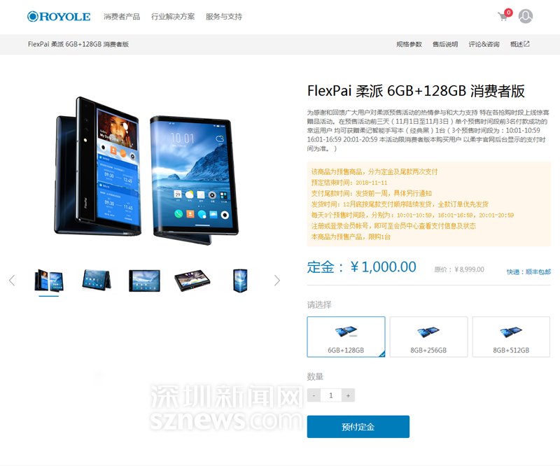 記者在柔宇官網(wǎng)看到,已于11月1日開啟預購的柔派消費者版有3個型號,需預付定金1000元,每天的預售時間段只有早上下午和晚上3個時間段,每個時間段只有58分鐘。從預售方式上看,吊足了人們的胃口