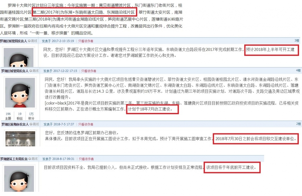 據(jù)了解,為改善居民出行條件,美化居住環(huán)境,羅湖區(qū)于2016年發(fā)布了十大微片區(qū)交通和景觀綜合提升工程計(jì)劃。該計(jì)劃表示全工程將分三年實(shí)施,而太白路-東湖路微片區(qū)屬第二期,應(yīng)于2017年開始動(dòng)工實(shí)施。但截至2018年11月,該項(xiàng)目仍未動(dòng)工。從網(wǎng)友發(fā)布的截圖上看,一個(gè)名為“羅湖區(qū)城管局發(fā)言人”的論壇賬號分別于2017年2月、12月以及2018年7月和8月對太白路-東湖路微片區(qū)景觀提升工程延遲實(shí)施的計(jì)劃進(jìn)行了回復(fù)。而相應(yīng)的動(dòng)工日期也從2018年上半年延遲到了2018年底。
