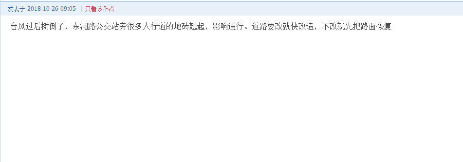 “再補(bǔ)一張,到2019年啦?!痹摼W(wǎng)友在發(fā)帖后的幾小時(shí)內(nèi),又補(bǔ)發(fā)了一張寫(xiě)有“2019年實(shí)施,2019年完工”的截圖。并配圖表示“臺(tái)風(fēng)過(guò)去快2個(gè)月了,東湖路的人行道石磚仍大片凸起,地鐵站前面的道路凹凸不平,從來(lái)沒(méi)有人來(lái)處理。”