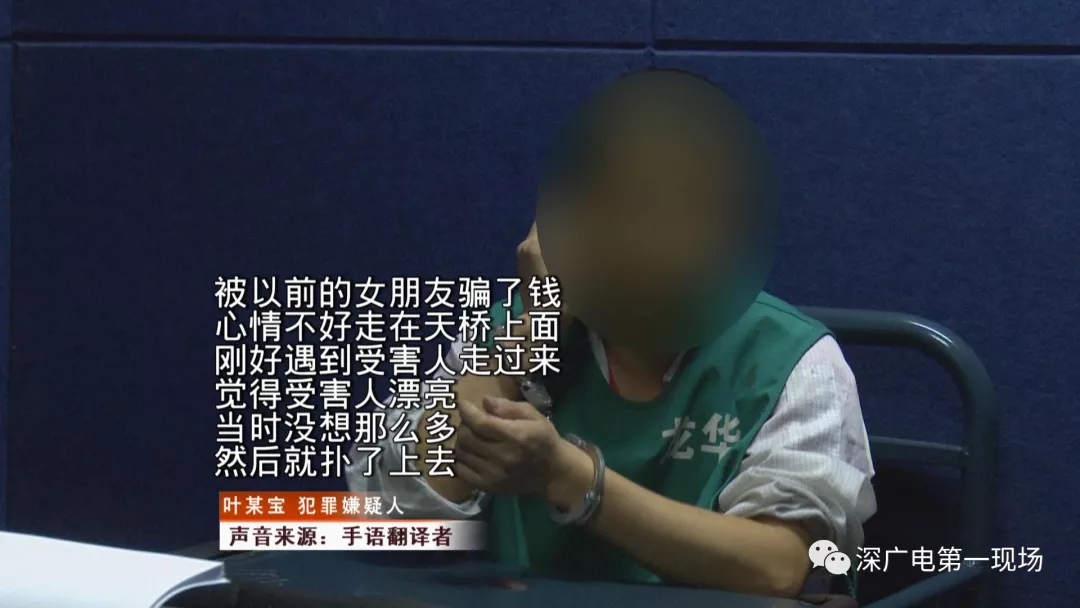 今天上午,記者在龍華油松派出所,見到了犯罪嫌疑人葉某寶。葉某寶是安徽人,今年31歲,在龍華區(qū)某工廠工作。在采訪時,記者發(fā)現(xiàn),犯罪嫌疑人葉某寶是名聽障人士,通過手語交談后了解到,11月2號晚上七點多,他途經建設東路人行天橋時,對小王起了“歹心”。