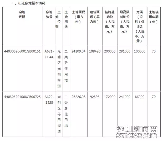 本次出讓的兩宗地分別是位于光明區(qū)光明街道的A621-0044宗地和位于光明區(qū)馬田街道的A629-1328宗地。前者土地面積24109.04平方米,建筑面積108490平方米,掛牌起始價(jià)20億元;后者土地面積26226.98平方米,建筑面積92398平方米,掛牌起始價(jià)17.2億元。土地使用權(quán)均為70年。其中,A621-0044宗地人才住房初始配建面積為9800平方米,A629-1328宗地人才住房初始配建面積為8100平方米。