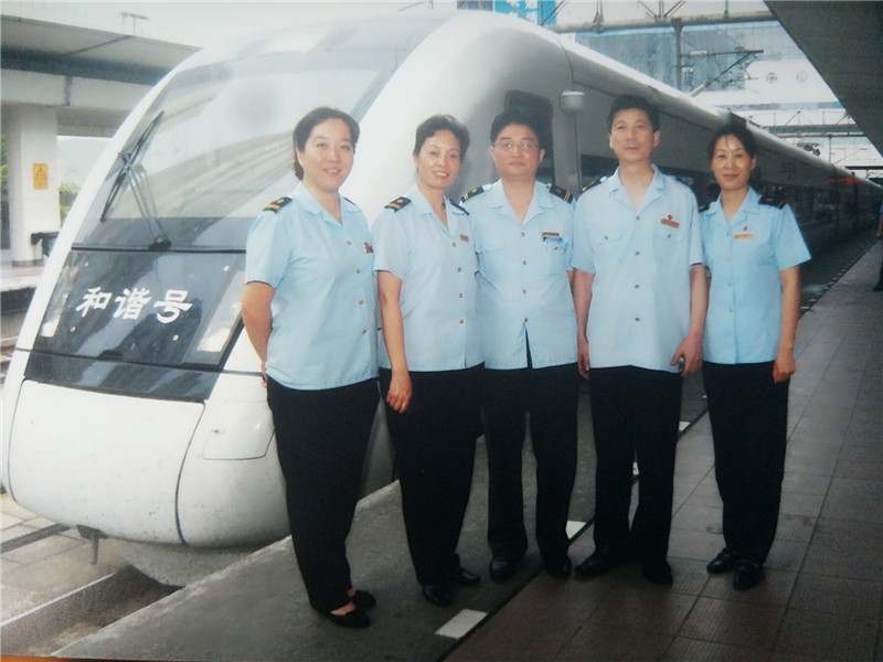 深圳火車站開行第一趟和諧號(hào),葉迎春(右一)和同事在列車前合影