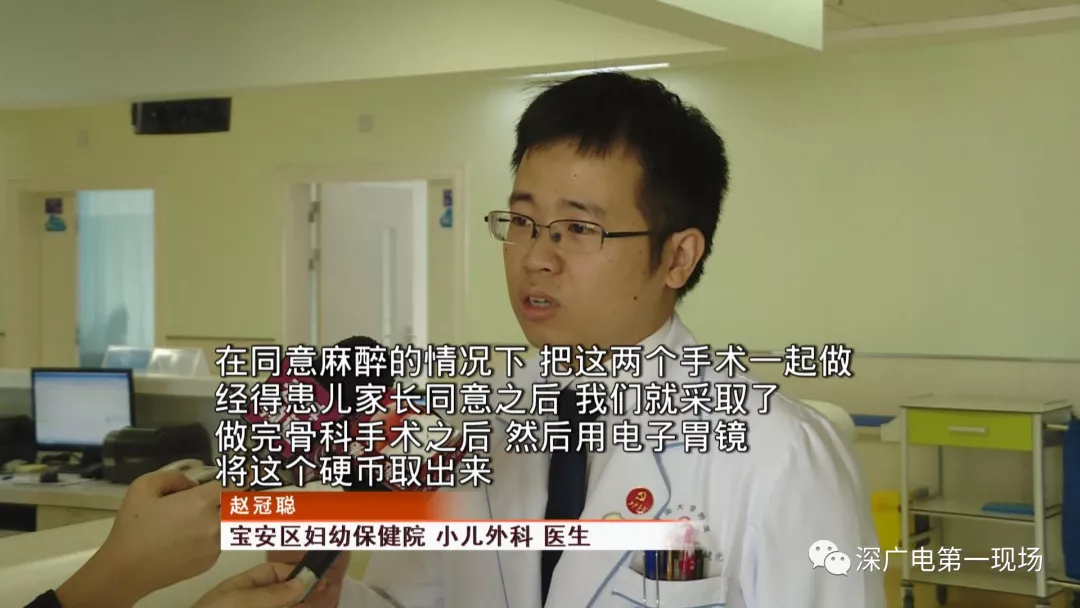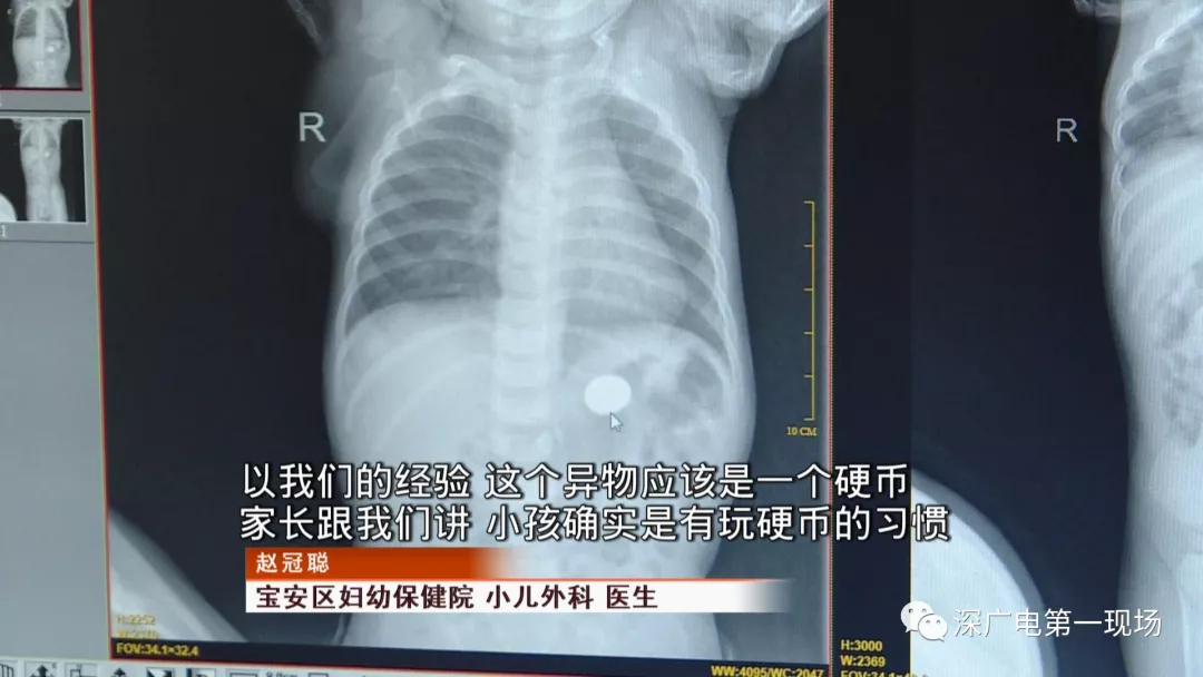 9月4號,一名1歲零5個(gè)月的男嬰因在家中摔傷,被父母送到了寶安區(qū)婦幼保健院,醫(yī)生診斷為左側(cè)尺橈骨骨折。在進(jìn)行全麻手術(shù)之前,院方例行對嬰兒進(jìn)行了周身檢查。手術(shù)前,兒外科醫(yī)生趙冠聰在查看患者的胸片時(shí),發(fā)現(xiàn)這名嬰兒的胃部有一枚硬幣大小的暗影。
