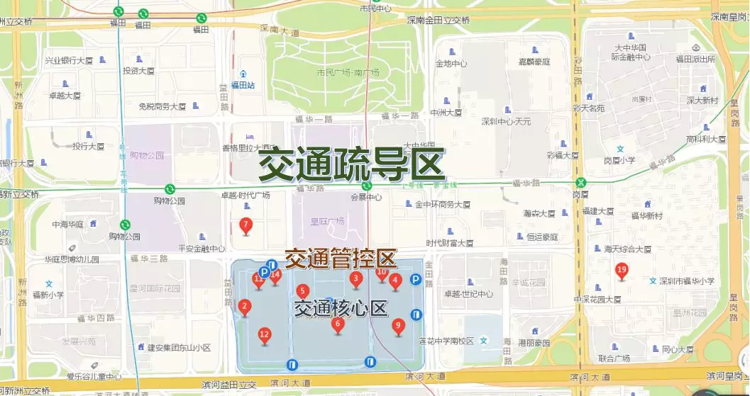 金田路、益田路、福華一路、福華路、福華三路、中心二路、中心三路、中心四路、海田路、民田路等道路為嚴(yán)管區(qū)