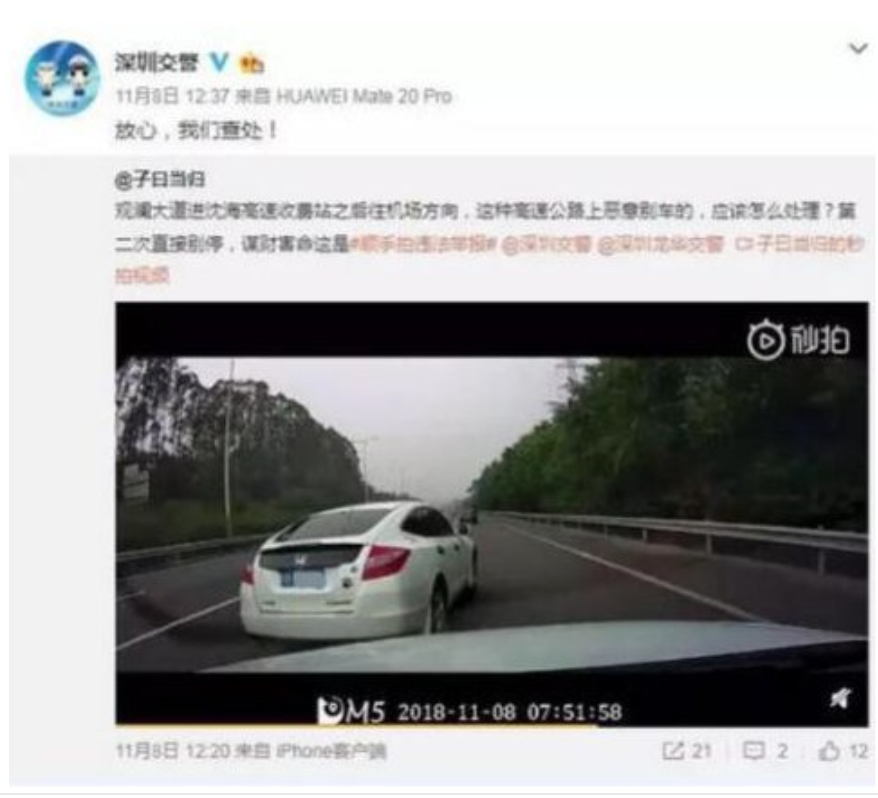 近日,深圳交警接到舉報稱:一公交大巴存在故意斗氣的情況,多次別停后方出租車。接到舉報后,交警立即展開調查,調取雙方車輛行車記錄儀發(fā)現,前車公交大巴從站臺駛出,因沒有及時避讓后方出租車,導致的士司機狂按喇叭,緊接著公交大巴開始呈 S型路線行駛,先右后左別停后方出租車三次!