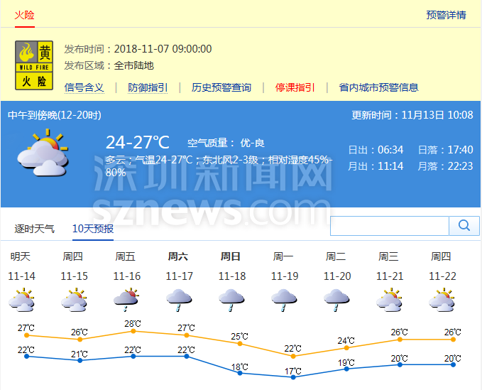 氣象局提醒市民,深圳市日間天氣干燥,火險(xiǎn)預(yù)警信號(hào)生效中,請(qǐng)?jiān)趹敉獾淖⒁夥阑稹?/p>