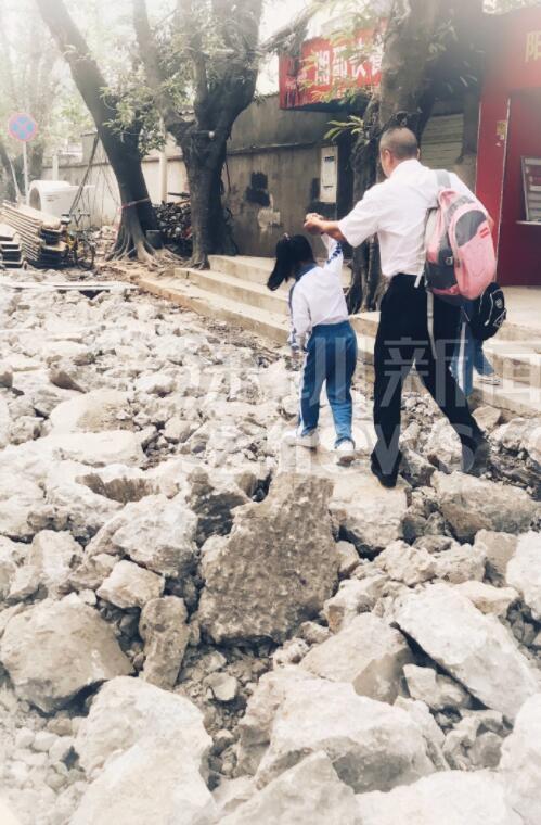 另有網(wǎng)友跟帖表示:同學(xué)們求學(xué)路坎坷,看得揪心!從現(xiàn)場圖可以看到,學(xué)生上下學(xué)都要穿過工地。路面被挖開,道路邊上只留下很窄的一條小道。上下學(xué)高峰期,成群結(jié)隊的學(xué)生在碎石穿行,旁邊小道上行人、三輪、電動單車堵成一鍋粥,存在很大的安全隱患。
