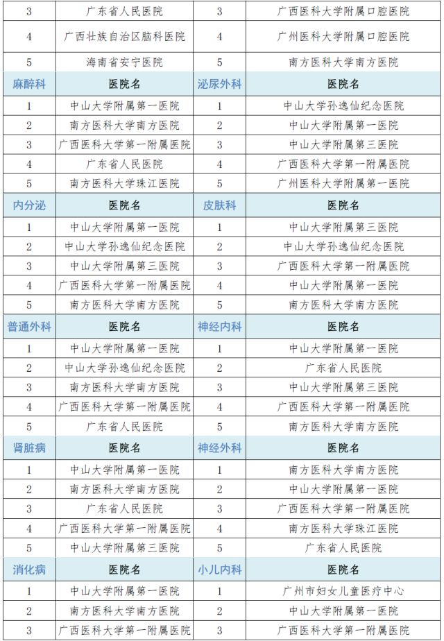 此外,廣東進入全國??魄笆钠渌麑?朴?中山三院的風濕科;廣州市精神衛(wèi)生中心(廣州惠愛醫(yī)院)的精神醫(yī)學(xué);中山大學(xué)光華口腔醫(yī)院的口腔科;中山大學(xué)孫逸仙紀念醫(yī)院的泌尿外科、內(nèi)分泌科;廣州市婦兒中心的小兒外科;廣州醫(yī)科大學(xué)附屬第一醫(yī)院的胸外科;中山大學(xué)附屬腫瘤醫(yī)院的胸外科與腫瘤學(xué)。
