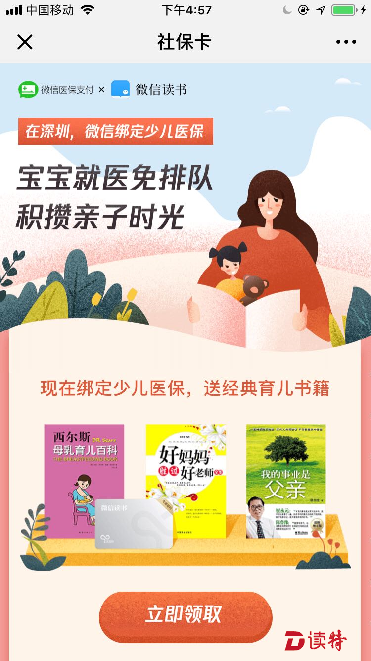 深圳特區(qū)報(bào)2018年11月21日訊 作為微信醫(yī)保支付的試點(diǎn)城市,深圳又開通便民新服務(wù),全國內(nèi)率先開通微信綁定少兒社??ǎС稚賰横t(yī)保線上支付服務(wù)。記者獲悉,11月20日起,父母在微信綁定孩子的少兒社??ǎ涂梢杂梦⑿派贤ㄟ^醫(yī)保給孩子繳納掛號(hào)、就診費(fèi)用,省去排隊(duì)煩惱。此外,20日起,用戶在微信綁定少兒社??ǎ擅赓M(fèi)領(lǐng)取微信讀書三本經(jīng)典育兒書籍和3天無限閱讀卡兌換碼。
