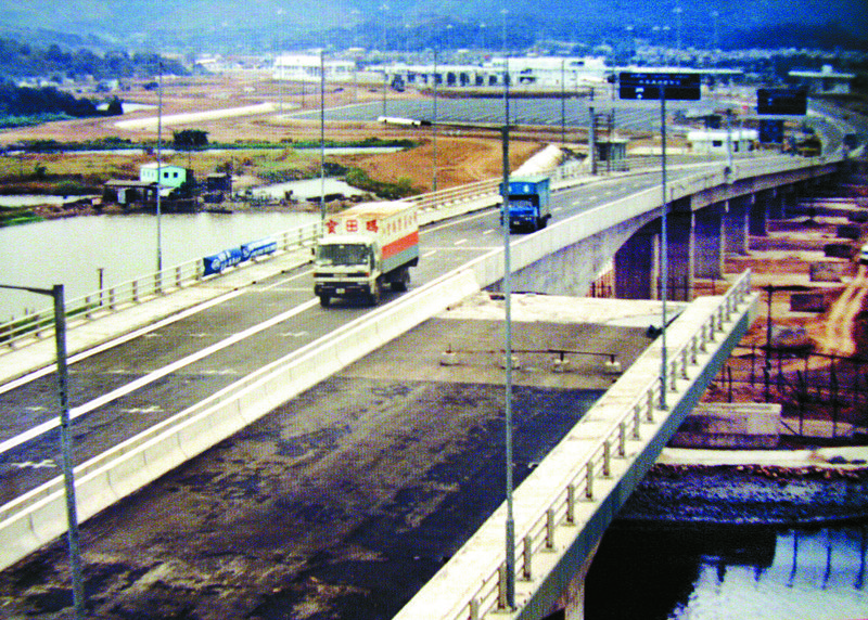 1989年12月26日,皇崗口岸開(kāi)通時(shí)的第一輛入境貨柜車,當(dāng)時(shí)落馬洲大橋只建成一半。 黃國(guó)春 攝