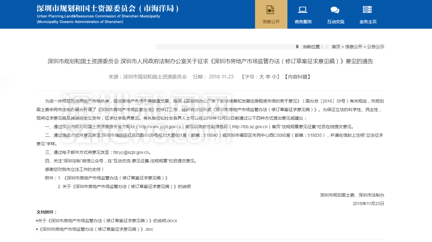 深圳新聞網(wǎng)11月24日訊(記者 張玲)深圳市房地產(chǎn)行業(yè)將取消年檢制度,改為年報(bào)制度、銷售價(jià)格以數(shù)據(jù)共享方式備案、預(yù)售條件為完成地面以上三分之一層數(shù)、房地產(chǎn)開發(fā)企業(yè)不得拒絕購(gòu)房人使用住房公積金貸款、人均租住建筑面積不得低于6㎡……實(shí)施已有8年的《深圳市委房地產(chǎn)市場(chǎng)監(jiān)管辦法》要修訂了,11月23日,深圳市人民政府法制辦和深圳市規(guī)土委同時(shí)在官網(wǎng)發(fā)布通告,就修訂后的草案征求社會(huì)公眾意見。