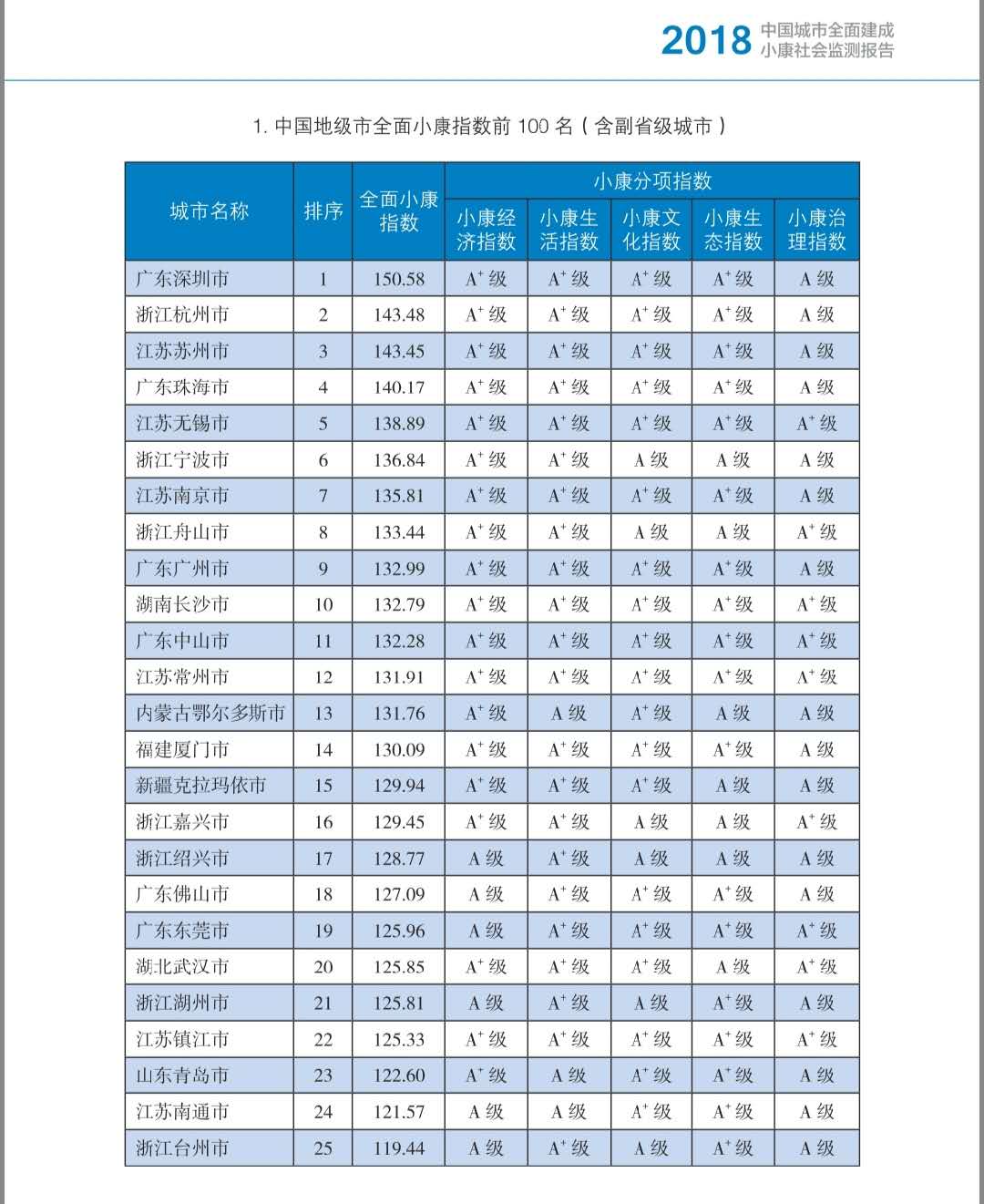 其中,深圳全面小康指數(shù)達(dá)150.58分,位列全國地級市(含副省級城市)全面小康指數(shù)前100名榜首。在分項指標(biāo)中,深圳的小康經(jīng)濟(jì)指數(shù)、小康生活指數(shù)、小康文化指數(shù)、小康生態(tài)指數(shù)均達(dá)到A+級,小康治理指數(shù)為A級。