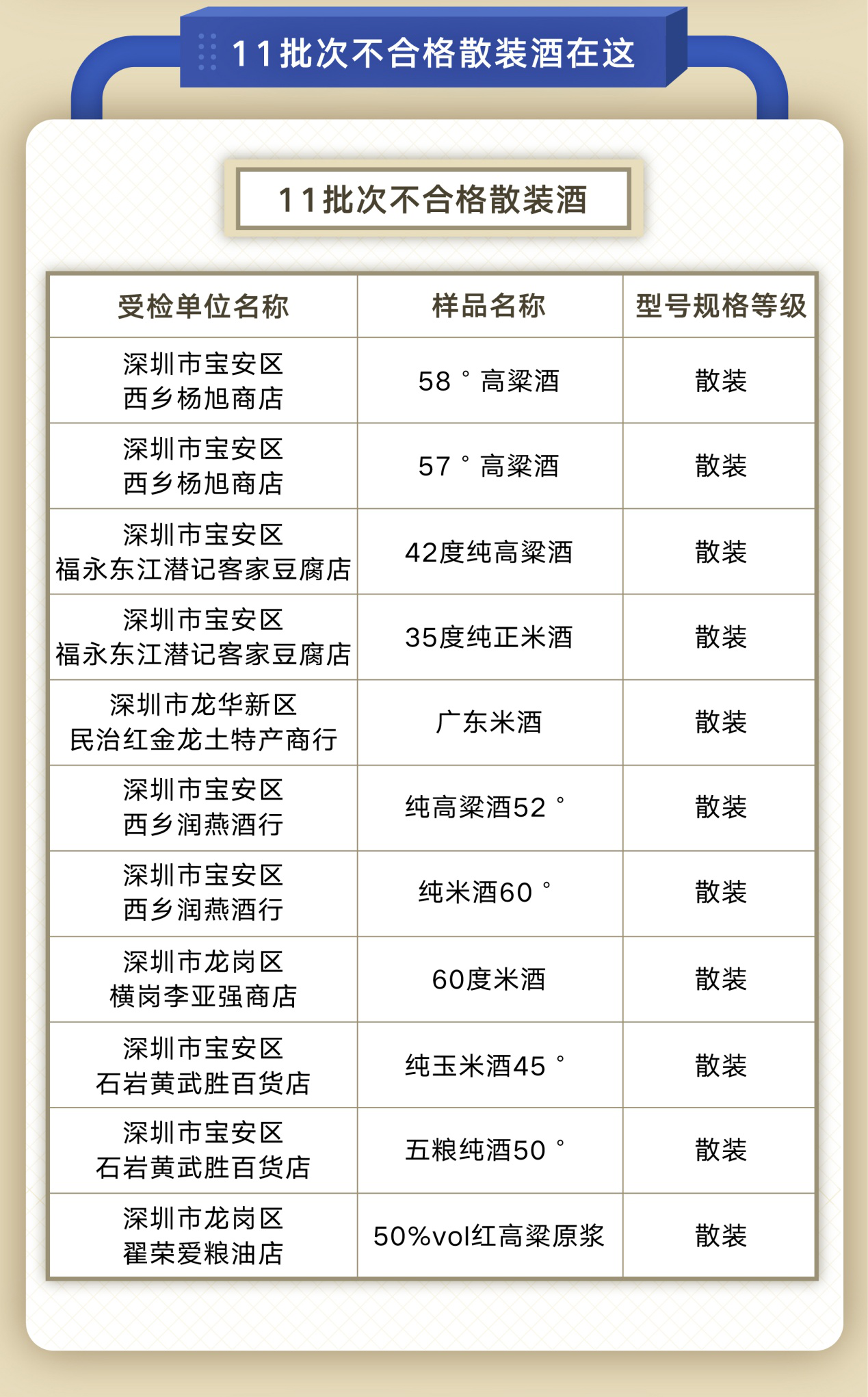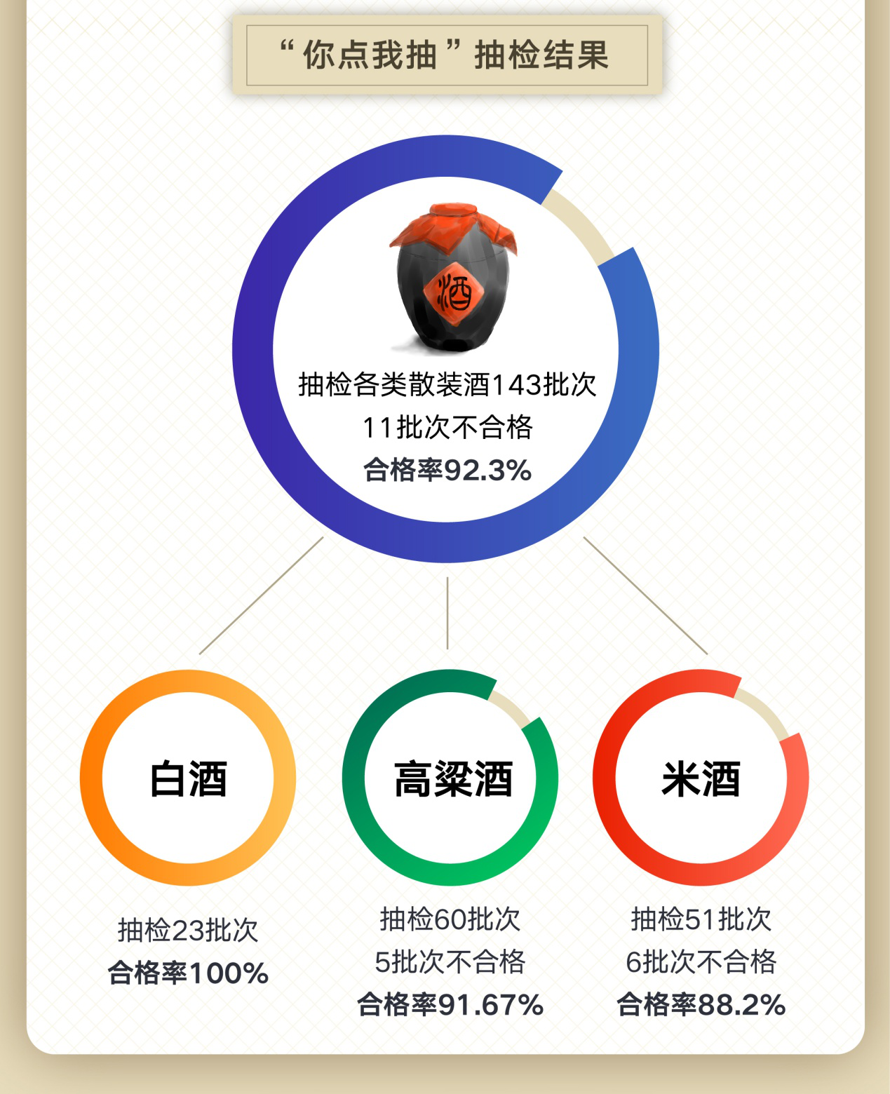 根據投票結果,此次共抽檢各類散裝酒143批次,11批次不合格,合格率92.3%。其中,抽檢白酒23批次,合格率100%;抽檢高粱酒60批次,5批次不合格,合格率91.67%;抽檢米酒51批次,不合格6批次,合格率88.2%。