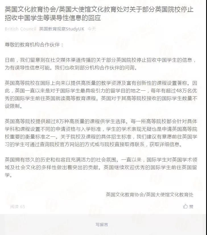記者發(fā)現(xiàn),英國文化教育協(xié)會(huì)/英國大使館文化教育處對關(guān)于部分英國院校停止招收中國學(xué)生這一信息已做出官方回應(yīng):他們留意到在社交媒體渠道傳播的關(guān)于部分英國院校停止招收中國學(xué)生的信息,為有誤導(dǎo)性信息可能。