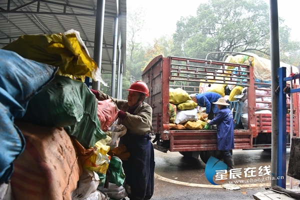 (白箬鋪鎮(zhèn)分揀回收總站的工作人員正對(duì)村里轉(zhuǎn)運(yùn)來的垃圾進(jìn)行分類。)