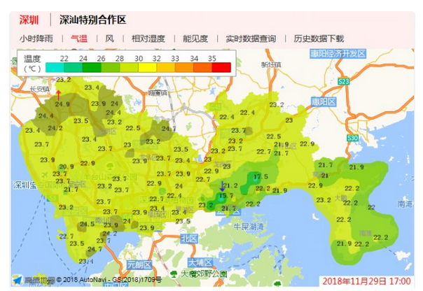 近期深圳天氣不穩(wěn)定,冷暖天氣交替切換頻道。預(yù)計未來一周天氣平穩(wěn),其中30日到12月2日多云,可見陽光,早晚清涼,部分時間有輕霧,30日氣溫18 ℃ ~25 ℃;另外,12月3日 ~12月6日濕度上升,間中有零星小雨,氣溫小幅波動。
