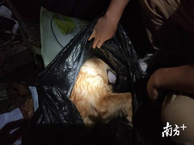 事后,愛心人士在南山市場附近的垃圾桶中找到了用黑色塑料袋包裹的小狗尸體,發(fā)現(xiàn)死去的寵物狗還是一只未成年的金毛幼犬。