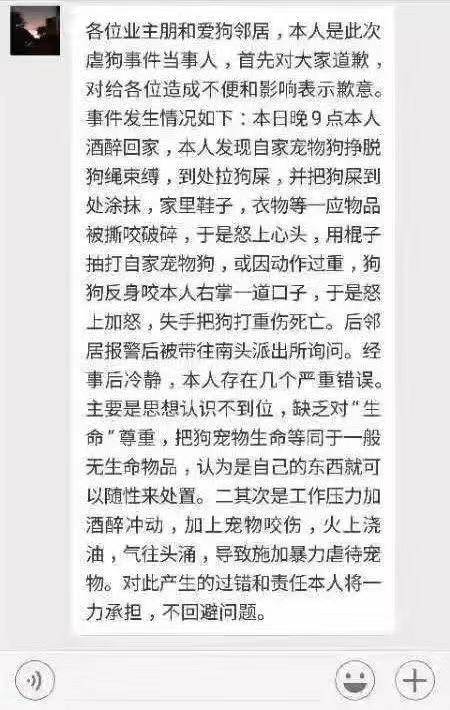 當(dāng)天深夜,男子在業(yè)主群中道歉,稱自己晚上9點醉酒回家,發(fā)現(xiàn)自家寵物狗掙脫狗鏈,到處拉屎還將家里的鞋子、衣物撕咬破碎,抽打自家寵物狗時,又被反咬一口,才會失手將狗打成重傷,同時男子表示“對此產(chǎn)生的過錯和責(zé)任本人將一力承擔(dān),不回避問題?!?/p>