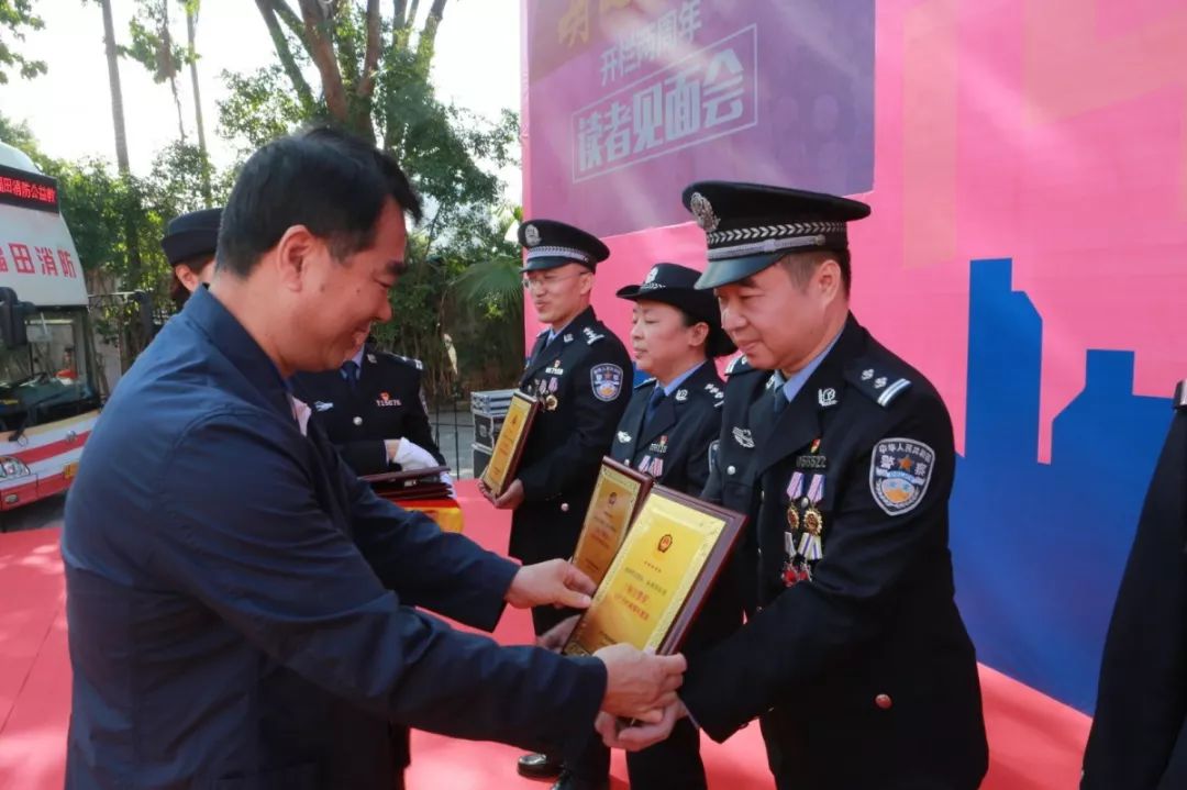 深圳市公安局與深圳特區(qū)報合辦的“每日警星”專欄讀者粉絲見面會在福田分局開放點(diǎn)火熱開展,來自深圳警隊刑偵、掃黑攻堅、治安、社區(qū)、特警、交警、預(yù)審等各個崗位的14名“每日警星”代表現(xiàn)場激情合唱中國人民警察警歌;徐文海與深圳報業(yè)集團(tuán)黨組副書記、副社長、總編輯周斌共同為“每日警星”代表頒發(fā)紀(jì)念牌。