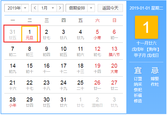 2019年元旦放假3天,其中2018年12月30日至2019年1月1日放假調(diào)休,2018年12月29日(周六)正常上班。