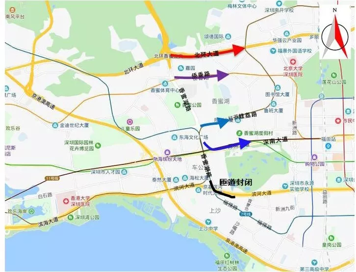 外圍繞行:原經(jīng)香蜜湖路輔道往濱河大道東行的車輛,可通過外圍北環(huán)大道、僑香路、紅荔路和深南大道提前繞行。