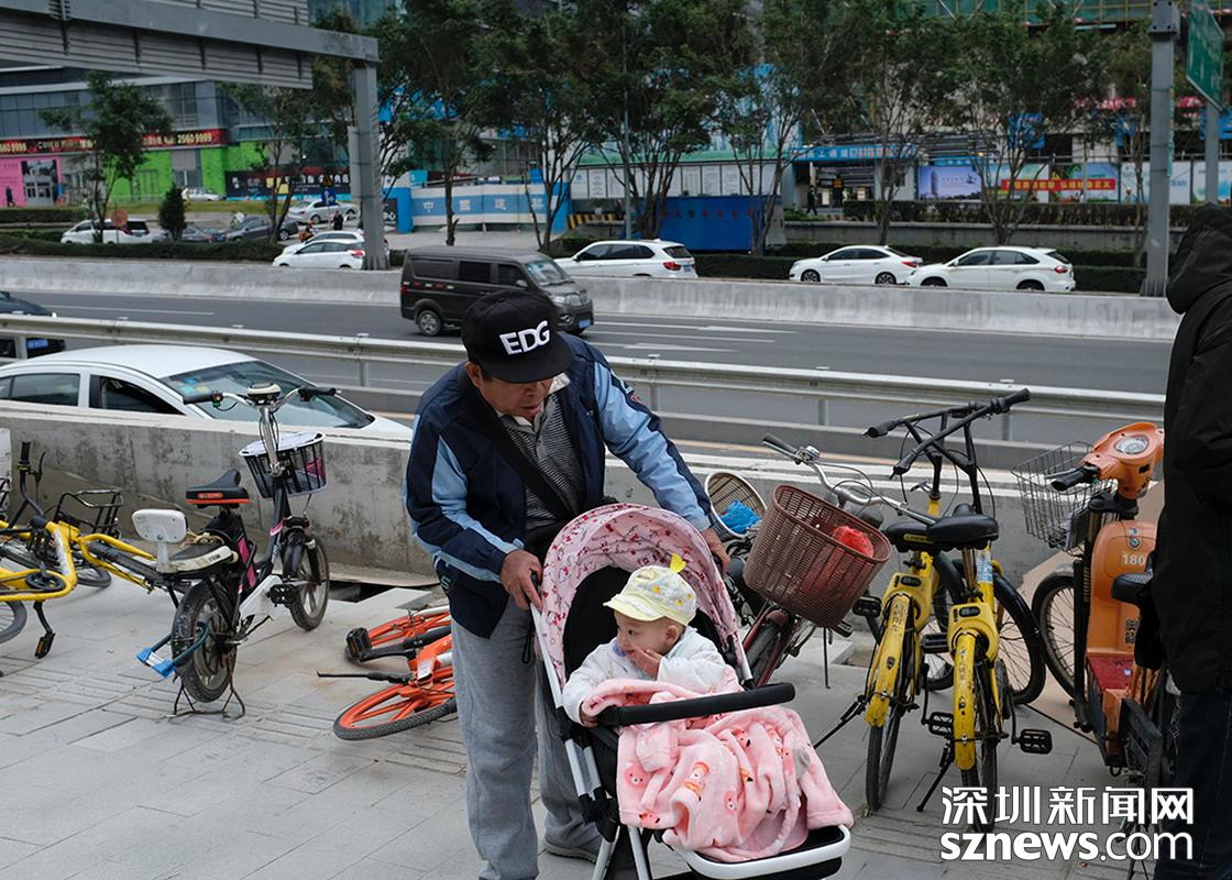 2018年12月12日,羅湖田貝地鐵站附近,一位和家長出行的小朋友蓋上了小被子御寒。