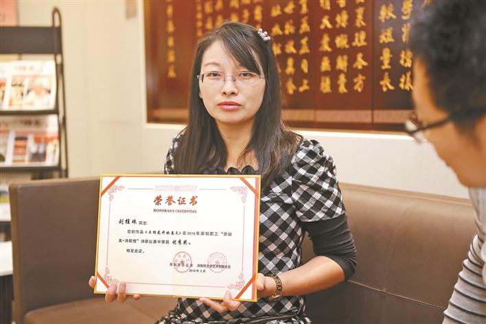 “近期,我剛剛加入了深圳市福田區(qū)作家協(xié)會。”劉桂珠告訴記者,她從高中的時候就喜歡寫作?!昂髞?,我來深圳打工之后,不管工作多忙多累,這個愛好都沒有間斷過,一直堅持到現(xiàn)在。它已經(jīng)成為我生命中的一部分了,可以說是一種生活習(xí)慣?!?/p>