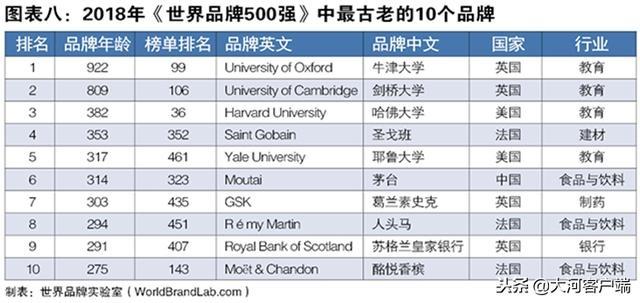 2018年度《世界品牌500強(qiáng)》的平均年齡達(dá)到100.14歲,相比去年的100.19歲略有下降。其中100歲及以上的“百年老牌”多達(dá)213個(gè),美國(guó)以92個(gè)占比達(dá)到4成。英國(guó)的兩所知名學(xué)府牛津、劍橋分別列為最古老品牌的前兩名。學(xué)校的歷史積淀是知識(shí)的沉淀感的最佳表象。除去擁有悠久歷史的著名大學(xué)之外,法國(guó)的老牌公司圣戈班Saint Gobain(353歲)是企業(yè)界擁有最長(zhǎng)歷史的品牌。中國(guó)入選的38個(gè)品牌中只有茅臺(tái)、青島啤酒、五糧液、中國(guó)銀行超越百齡。依行業(yè)來(lái)看,食品與飲料類(lèi)品牌最古老,100歲以上的入選品牌占到了27個(gè)。