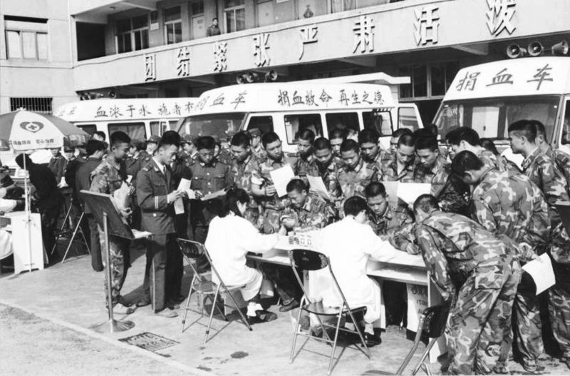 當年深圳有三輛伊維柯捐血車,1997年3月1日一起開到部隊,官兵爭相獻血。余海蓉攝