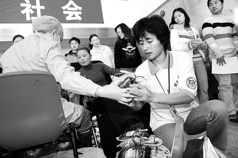 2006年,深圳獻血女狀元、獻血義工服務隊副隊長高敏在捐血現(xiàn)場協(xié)助醫(yī)生工作。許業(yè)周攝