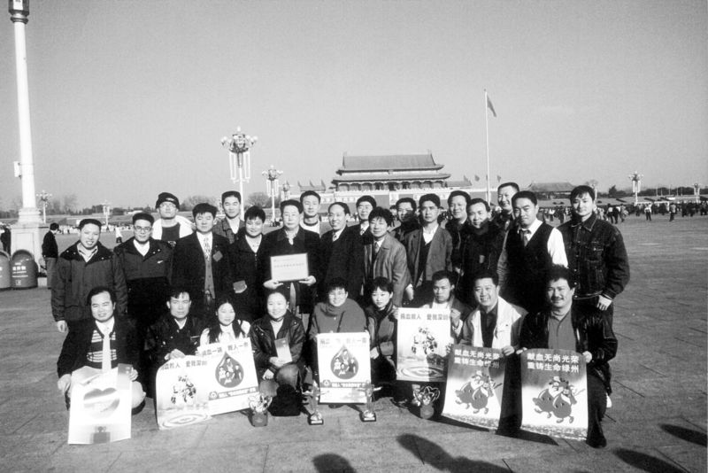 1999年,27位深圳市民獲得全國首批無償獻血金質(zhì)獎杯后在天安門前合影。余海蓉攝