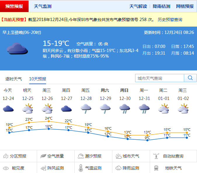 深圳新聞網(wǎng)2018年12月24日訊(記者 施冰冰)記者通過(guò)市氣象局了解到,深圳今天陰天間多云,有分散小雨;氣溫17-21℃;東北風(fēng)3-4級(jí),沿海和高地最大陣風(fēng)6-7級(jí);相對(duì)濕度65%-95%。