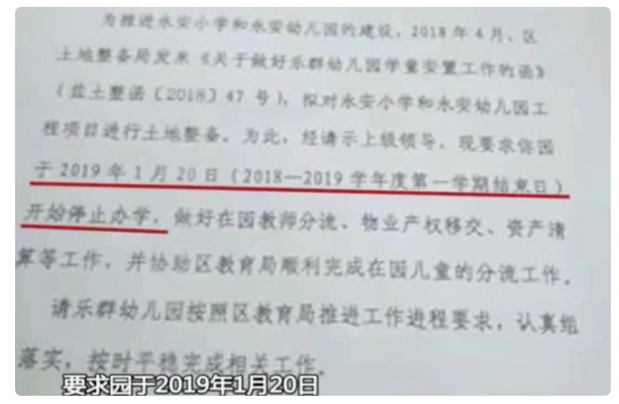 據(jù)了解幼兒園目前現(xiàn)有學(xué)生360名,教職工50人。在停辦通知上我們看見(jiàn):"要求園于2019年1月20日開(kāi)始停止辦學(xué)。"原因是"土地整備"包括劉先生在內(nèi)的家長(zhǎng)接到這個(gè)消息都炸開(kāi)了鍋,因?yàn)橥^k一事11月份才告知家長(zhǎng),距離新學(xué)期開(kāi)學(xué)不到三個(gè)月。