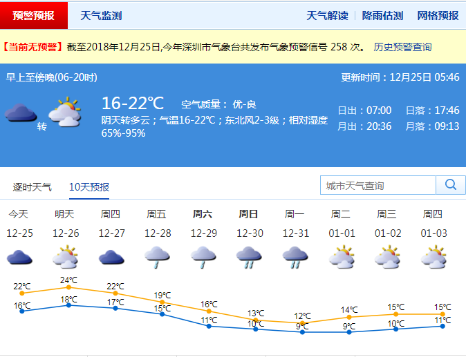 深圳新聞網(wǎng)2018年12月25日訊 連日來,受弱冷空氣南下活動(dòng)影響,與前期上空的暖濕氣流相遇,導(dǎo)致鵬城陰天并伴有小雨天氣,氣溫下降3℃-4℃。24日早晨最低氣溫普遍在14℃,天氣陰涼。市氣象臺(tái)預(yù)測(cè),未來三天轉(zhuǎn)多云天氣,氣溫回升,最高氣溫可達(dá)24℃。