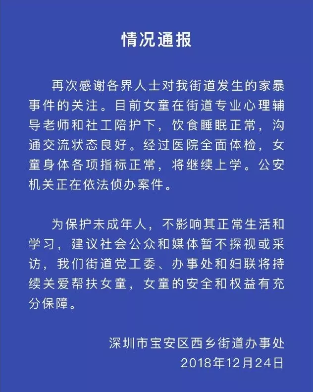 12月24日晚上,深圳市寶安區(qū)委宣傳部官方微博@陽(yáng)光寶安再次發(fā)布通告,稱(chēng)女童目前飲食睡眠正常,將繼續(xù)上學(xué)。公安機(jī)關(guān)正在依法偵辦案件。
