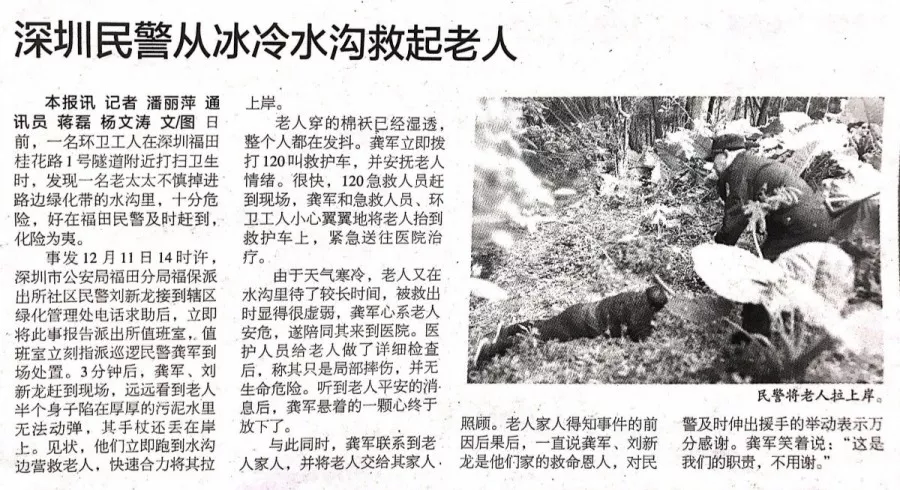 ★★老人不慎墜入水溝,福保派出所民警龔軍、劉新龍緊急出動救援,行動迅速,救援有力,老人轉危為安。這樣的事情經常發(fā)生,民警視群眾如親人,老吾老以及人之老。